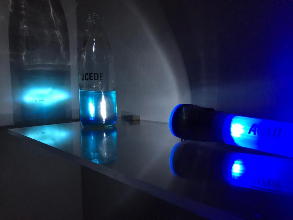 La pieza Foto-síntesis de Montserrat Ramírez, juega con elementos translúcidos, luz, agua, destellos y palabras para transmitir una fotografía que pertenece a distintos tiempos.