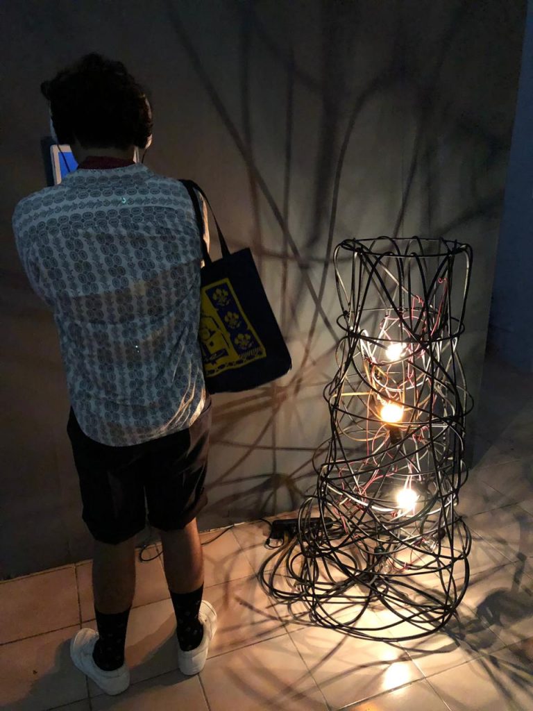 Otra obra es la de Valentina Lara con Modulador Cero, que a través de focos y cables enredados representa a un cuerpo que reacciona a las diferentes condiciones del espacio y emite estímulos de vitalidad y energía.
