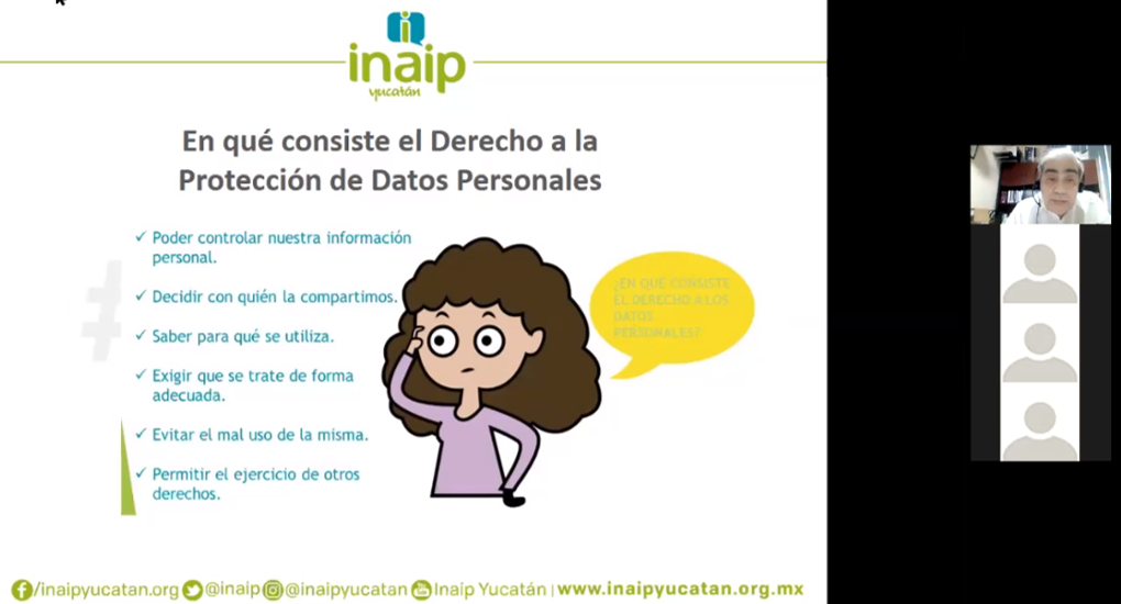 Mérida, Yucatán, a 19 de noviembre 2020.- Los avances tecnológicos hacen que los datos relacionados con los individuos se almacenen, procesan o transmiten en formato digital, lo cual ha creado oportunidades para los cibercriminales que buscan lucrar con esa información, advirtió el comisionado presidente del Instituto Estatal de Transparencia, Acceso a la Información Pública y Protección de Datos Personales (INAIP), Aldrin Briceño Conrado.