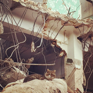 No me atrevo a hablar de la ciudad o del país, como lo dije antes: sigo siendo un turista. Me atrevo a hablar de la situación porque no me es ajena del todo. En mi ciudad y mi país también hay escombros y desplazados. La imagen de esta casa en ruinas pronto será sólo un recuerdo, por eso me apuro a escribir sobre ella. Me siento identificado con esos gatos porque algo parecido nos pasó en el lugar en que vivía. Hace un par de años alguien dejó nuestro hogar en ruinas; y nosotros, llenos de incredulidad y espanto, no sabíamos si debíamos quedarnos y reclamar el espacio como nuestro o marcharnos a un lugar seguro y empezar de nuevo.