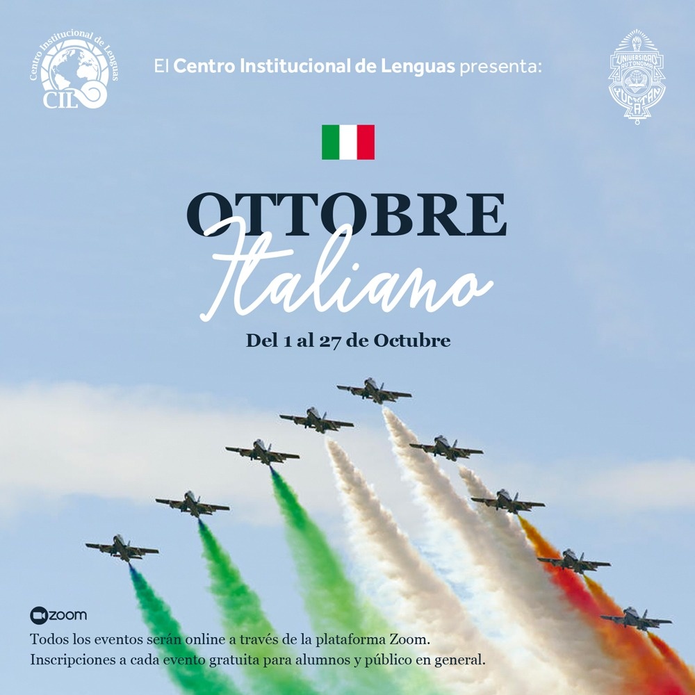 Mérida, Yucatán, 15 de septiembre del 2021.- La lengua y cultura de Italia podrán conocerse a través de clases de cocina, talleres de música, conferencias y un cineclub, durante el evento “Ottobre italiano”, organizado por el Centro Institucional de Lenguas de la Universidad Autónoma de Yucatán (CIL-UADY).