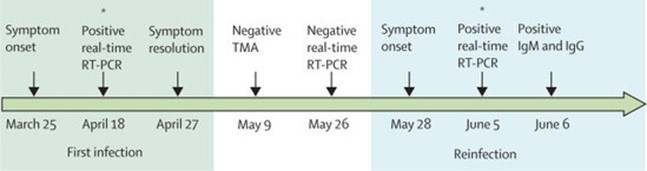 El paciente antes mencionado, dio positivo a dos pruebas de SARS-CoV-2, la primera el 18 de abril de 2020 y la segunda el 05 de junio de 2020, separadas por dos pruebas negativas realizadas en mayo de 2020. El análisis genómico mostró variantes genéticamente diferentes en cada caso de la infección. La segunda infección fue sintomáticamente más grave que la primera.