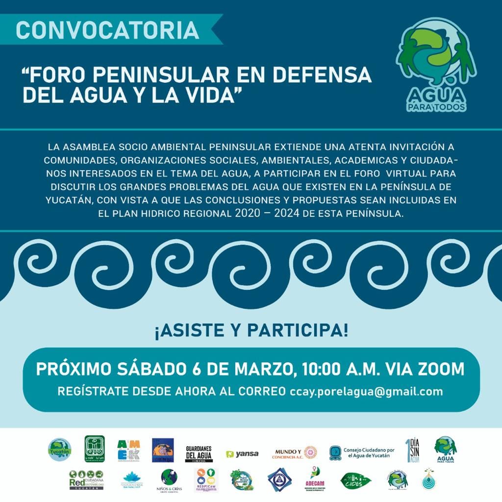 Con el objetivo de que en ese próximo Programa Hídrico Regional de la Península de Yucatán se encuentren representados de manera amplia los sentires y saberes de las comunidades y los sectores sociales, diversas organizaciones medio ambientales de la región, agrupados en la Asamblea Socioambiental de la Península de Yucatán, hacemos una atenta invitación a toda la población de los tres estados peninsulares a participar en el Foro Peninsular en Defensa del Agua y de la Vida, que tendrá verificativo a través de videoconferencias interactivas, este próximo sábado 6 de marzo a partir de las 10:00 am en Campeche y Yucatán, 11:00 am en horario de Quintana Roo.