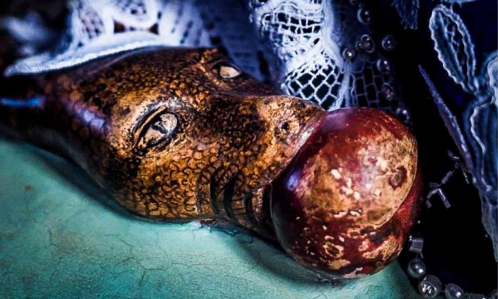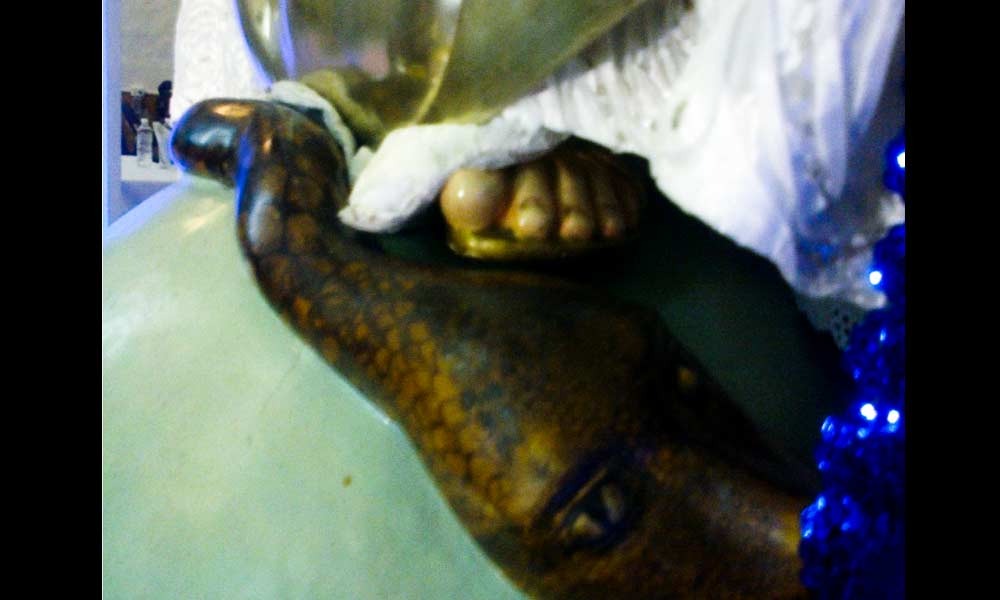 Detalle de la serpiente a los pies de la Virgen de Izamal