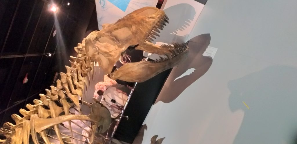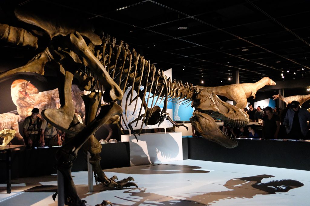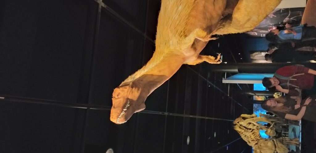 El recorrido a su vez, ofrece a los visitante la oportunidad ver un modelo hiperrealista, de tamaño histórico del T-Rex con esa suerte de plumas o pelos que lo caracterizan, reconstrucciones de varias crías, e incluso es posible escuchar sus rugido así como la narrativa evolutiva de esta especie, mostrando más de 100 millones de años de marcha hasta llegar al Tiranosaurio.