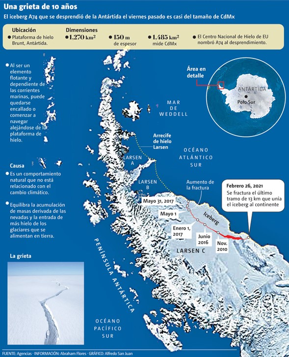 El iceberg tiene casi el tamaño de Ciudad de México con 1,485 km2, e incluso supera en dimensión a Chapala, el mayor lago del país que cuenta con un área de 1,112 km2.