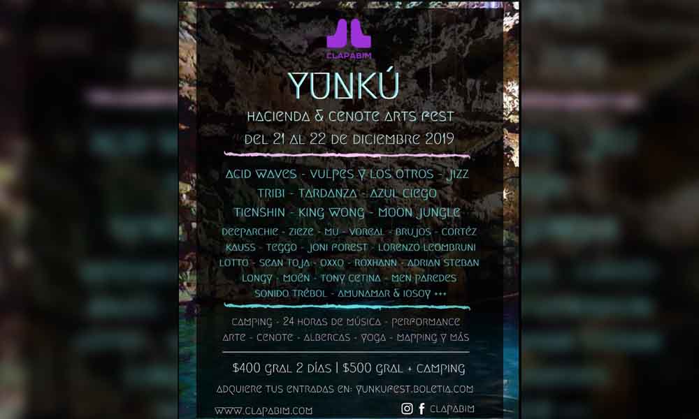Este sábado 21 y domingo 22 de diciembre, se llevará a cabo el “Yunkú Hacienda & Cenote Arts Fest”, festival que plantea un nuevo concepto de conexión con la naturaleza al mismo tiempo que permitirá disfrutar propuestas nuevas y frescas de artistas visuales, artistas circenses, música y Dj’s en vivo.