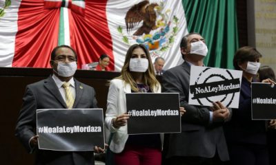 Diputados del PRD, portando cubrebocas y pancartas, tomaron la tribuna en la Cámara de Diputados para protestar en contra de lo que llamaron la “ley mordaza”....