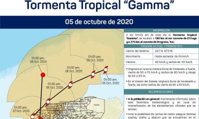 La Tormenta Tropical Gamma, se localiza a 130 km al nor-noreste de El Cuyo y a 275 km al noreste de Progreso, Yucatán; y se desplaza...
