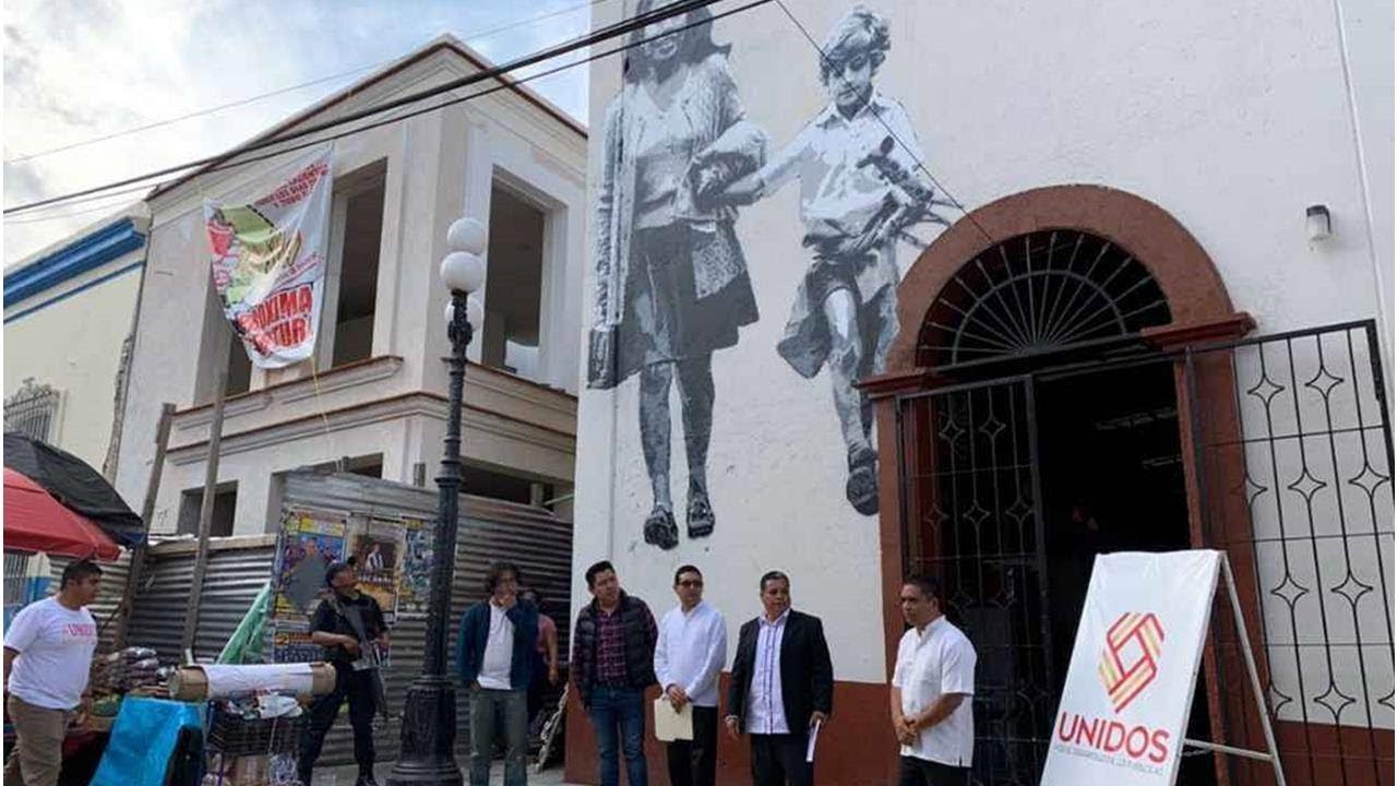 El mural, de cinco metros 40 centímetros de alto por cuatro metros de ancho, está plasmado sobre una de las fachadas del mercado municipal “Benito Juárez”.