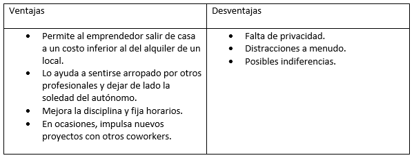 A continuación, un cuadro que describe las ventajas y desventajas del coworking: