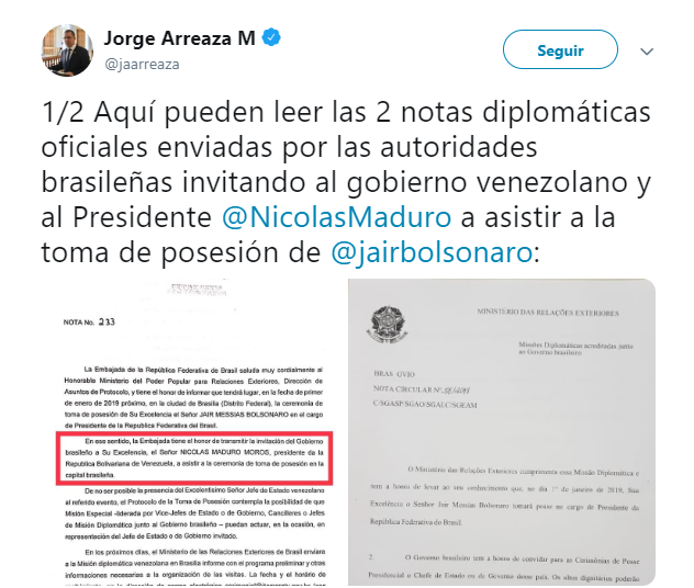 “En respeto al pueblo venezolano, no invitamos a Nicolás Maduro a la posesión del PR Bolsonaro”, justificó Araújo en un tuit. “No hay lugar para Maduro en una celebración de la democracia y del triunfo de la voluntad popular brasileña. Todos los países del mundo deben dejar de apoyarlo y unirse para liberar a Venezuela”.