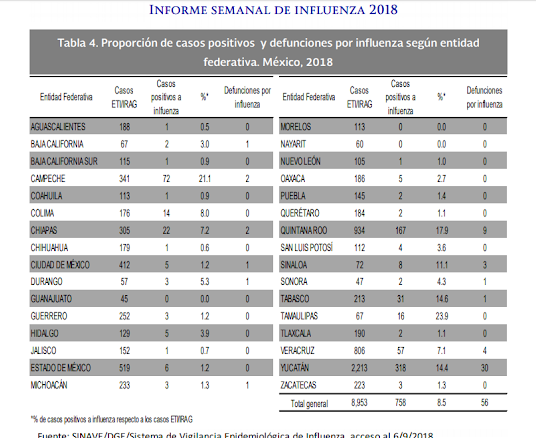 Las entidades con mayor número de casos confirmados de influenza en la temporada 2018, son Yucatán, Quintana Roo, Campeche, Veracruz y Tabasco.
