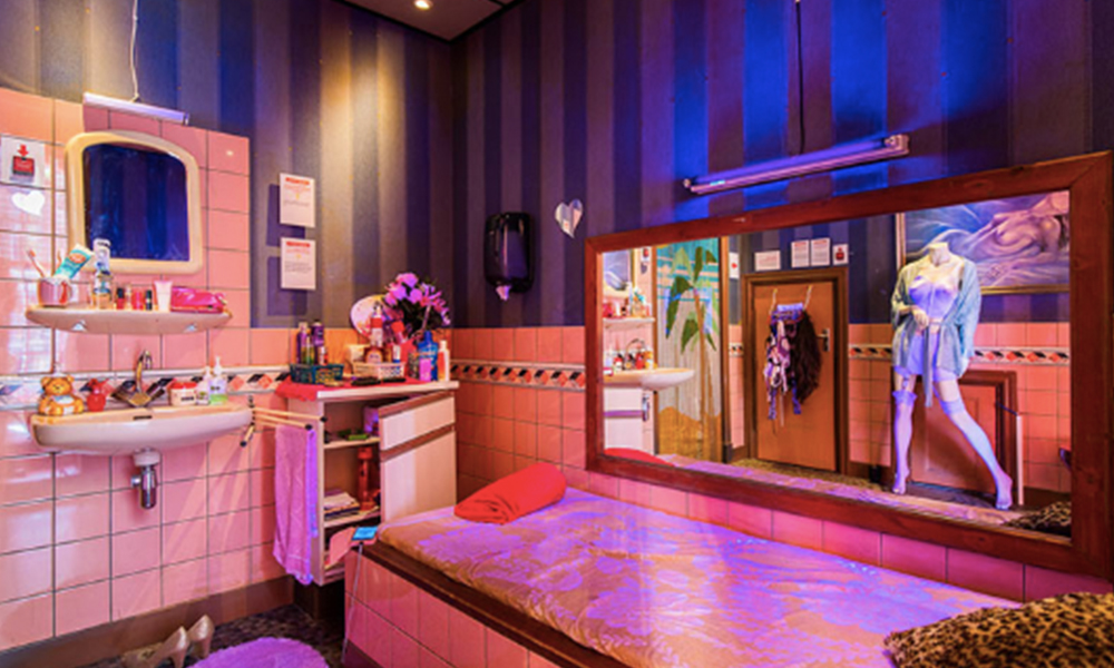 Puedes estar en el interior de las estrechas casas de los escaparates del Red Light Distric, donde se recrea una habitación de un club. Las prostitutas que trabajan en el Barrio Rojo tienen entre 21 y 55 años, muchas jóvenes que no alcanzan a pagarse los estudios universitarios o madres solteras, y en el 70 % de los casos, con una pareja estable, según fuentes del propio Museo.