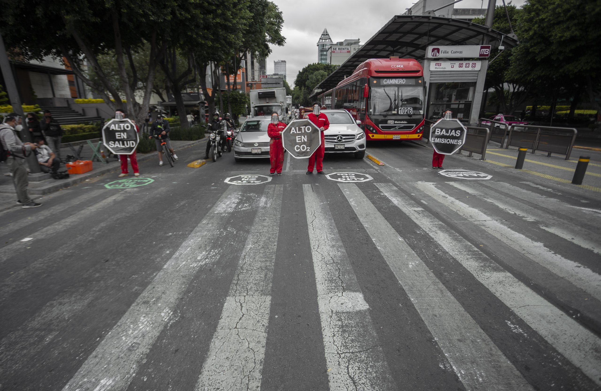 Con los mensajes “alto en CO2” (dióxido de carbono), para el carril de autos; “bajas emisiones”, para el del Metrobús y “alto en salud”, para el de ciclovía, los integrantes de la CCE recalcaron su demanda de que las ciclovías puestas en marcha de manera emergente, como una medida para evitar las aglomeraciones de las personas en el transporte público ante la pandemia por COVID-19, se vuelvan permanentes.