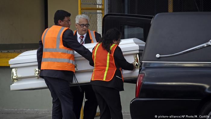 Representantes de la cancillería guatemalteca recibieron el féretro blanco de Jakelin Caal en el aeropuerto internacional de Ciudad de Guatemala y trabajadores con chalecos naranja lo subieron a una carroza fúnebre color negro.