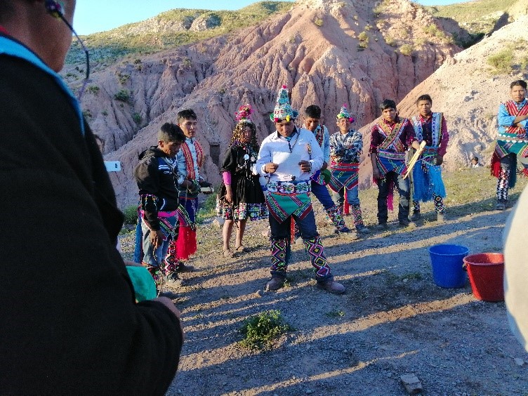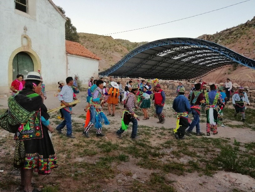 A las 5 de la tarde se puede ver la llegada de un grupo de danzarines y músicos que bajan por el Este del cerro de Acsara; el brillo de pequeños espejos en los atuendos de las mujeres solteras, permitían advertir a larga distancia el recorrido del baile. Mientras los esperábamos que lleguen a la iglesia colonial de la comunidad, los pobladores del lugar decían: ya “bajaran del norte y del oeste” también. Mujeres y hombres de la comunidad Actara esperaban con sus trajes de fiesta la llegada de los demás grupos para incluirse.