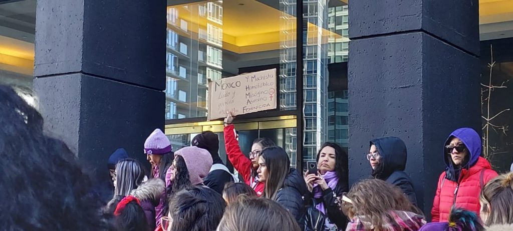 Al arribar a las puertas de la sede diplomática, la Cónsul de México en Vancouver, Berenice Díaz Ceballos, recibió a las manifestante e indico que enviaría su mensaje de protesta al gobierno de México, señalando que el Consulado en esa ciudad se unirá al paro del #9M que tendrá lugar el día de mañana.