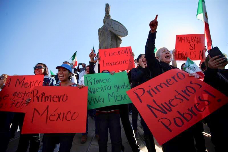 Un gran número de ciudadanos, algunos residentes de San Diego, California, salieron este domingo a las calles de Tijuana para protestar por la llegada masiva de migrantes centroamericanos que esperan solicitar asilo a Estados Unidos.