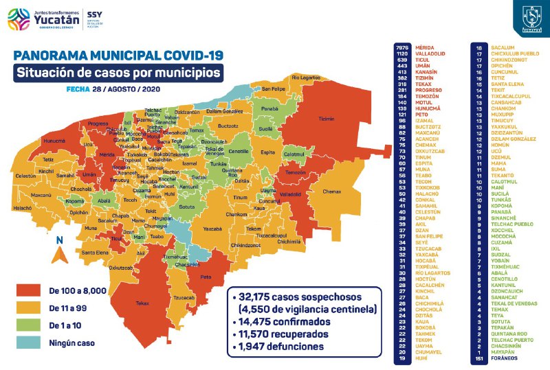 Por otro lado, la dependencia comunicó que en las últimas 24 horas se confirmaron 102 diagnósticos de la enfermedad: 55 en Mérida; siete en Ticul; seis en Valladolid; cinco en Tizimín; tres en Motul, Temozón y Tzucacab; dos en Espita, Hunucmá y Peto; uno en Abalá, Baca, Celestún, Conkal, Dzidzantún, Dzitás, Izamal, Kanasín, Oxkutzcab, Sacalum, Samahil, Tekax y Umán; y uno foráneo.