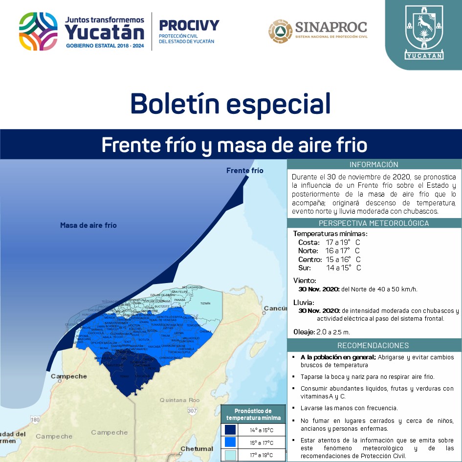 “Estamos muy al pendiente del comportamiento de este frente frío, pues es el primero que viene acompañado de masa de aire frío polar, por lo cual se estaría teniendo un descenso real en las temperaturas”, informó a través de un comunicado el coordinador de PROCIVY, Jesús Enrique Alcocer Basto.
