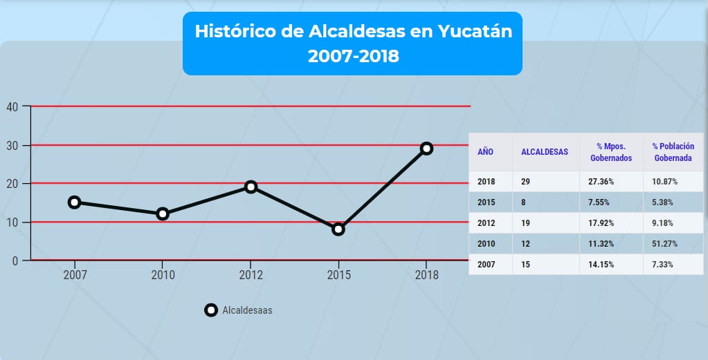 Al final, 29 mujeres resultaron electas, pero solamente gobiernan a 10.87% de la población yucateca. “Los partidos le dieron la vuelta al principio de paridad”, explicó Gina Villagómez Valdez, investigadora de la Universidad Autónoma de Yucatán (UADY).