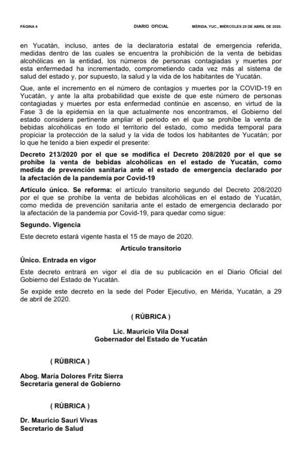 El Ejecutivo estatal alargó la “ley seca” en Yucatán: la prohibición de la venta de bebidas con alcohol se extenderá hasta el próximo 15 de mayo como medida para prevenir contagios de COVID-19 (coronavirus).