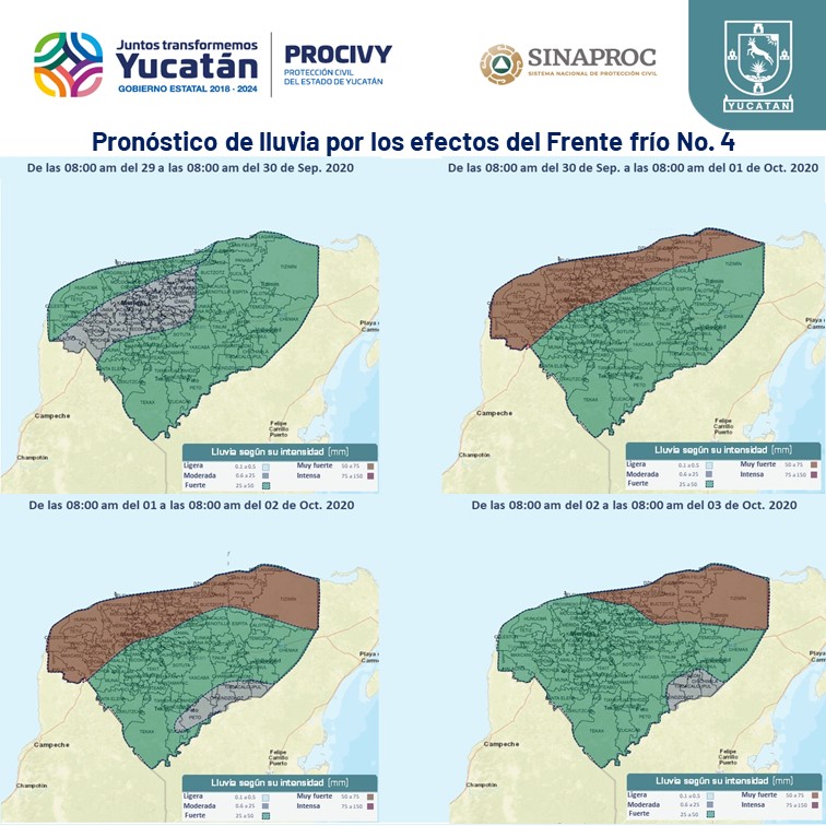 De acuerdo con el organismo, la vaguada prefrontal propiciará precipitaciones entre moderadas y fuertes, sobre todo en el norte, este y sur de la entidad. El frente frío No. 4 será el primero en alcanzar la Península en esta temporada, por lo cual no se espera un descenso de temperatura significativo. Pero el evento sí estará acompañado de lluvias que se mantendrían durante los próximos días.