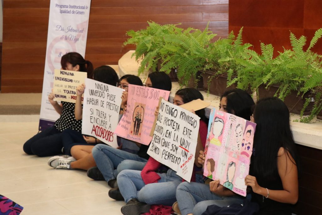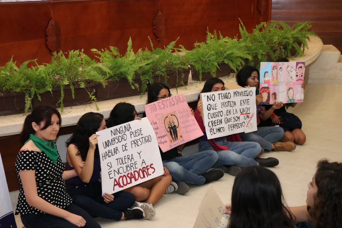 Durante la ceremonia inaugural de las actividades organizadas por la Universidad para conmemorar el Día Internacional de las Mujeres, un grupo de jóvenes se instaló frente a la mesa del presídium –integrado por autoridades de la institución y el propio rector-, con carteles, en los que se leían frases como “Ninguna universidad puede hablar de prestigio si tolera y encubre a acosadores” y “No tengo privilegio que proteja este cuerpo, en la UADY creen que soy un blanco perfecto”.