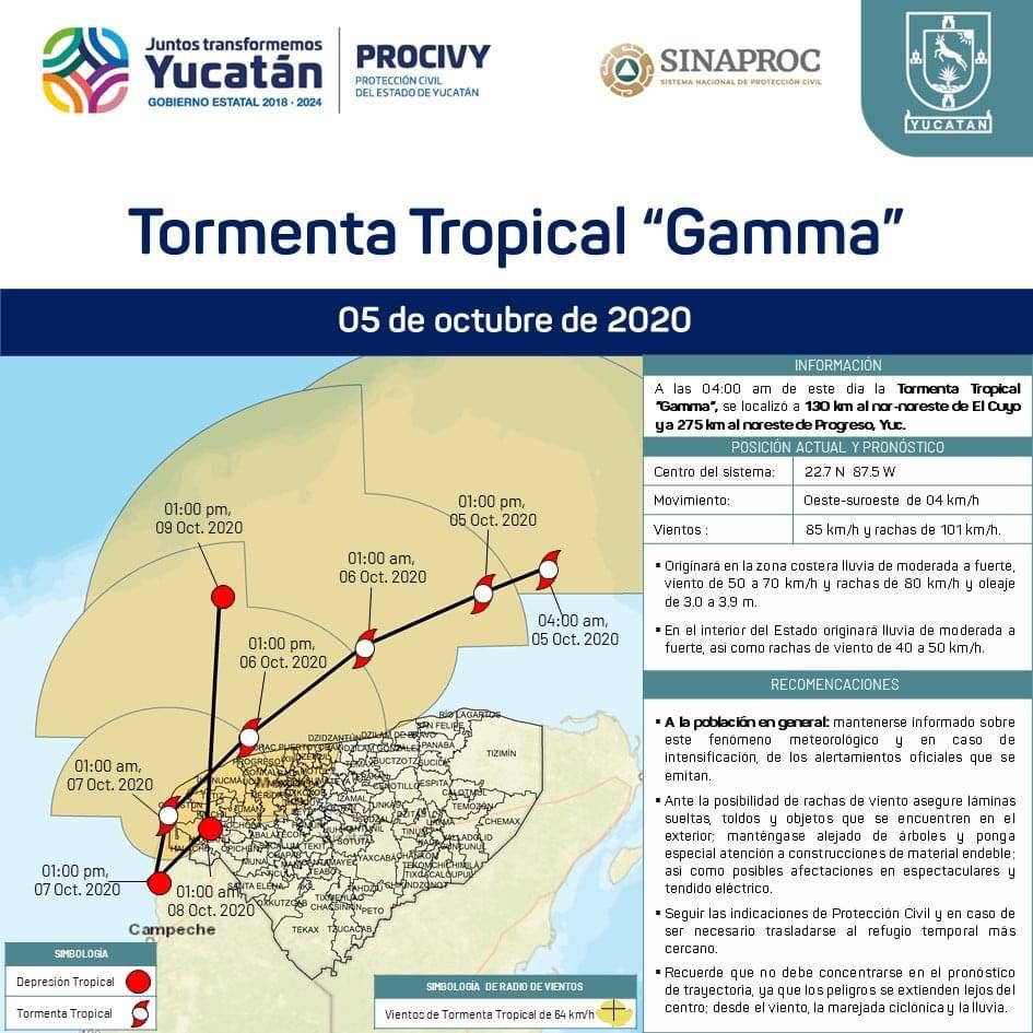 La Tormenta Tropical Gamma, se localiza a 130 km al nor-noreste de El Cuyo y a 275 km al noreste de Progreso, Yucatán; y se desplaza hacia el oeste-suroeste a una velocidad de 4 km/h con vientos de 85 km/h.