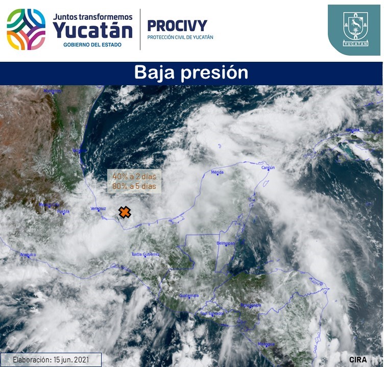 La zona de inestabilidad atmosférica se encuentra a 460 kilómetros al suroeste de Celestún y se espera que evolucione a depresión tropical en estos días, aunque los modelos de trayectoria indican un desplazamiento hacia el norte, por lo que no representa riesgo para Yucatán.