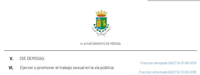 A finales de octubre, al resolver un amparo promovido por 16 trabajadoras sexuales, el Juzgado Tercero de Distrito declaró inconstitucional la fracción VI del artículo 15 del Reglamento de Policía y Buen Gobierno del Municipio de Mérida, pues discrimina a quienes ejercen el trabajo sexual en la vía pública.