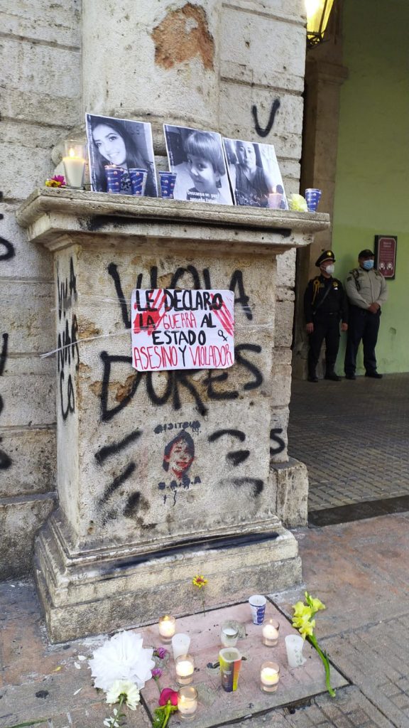 Mérida, Yucatán, 9 de agosto de 2021.- Los nombres de Teresa, María Pilar, Dolores y otras víctimas de feminicidio en el estado resonaron frente el Palacio de Gobierno en la tarde del domingo, cuando decenas de ciudadanas realizaron una velada para recordar a las mujeres asesinadas por razones de género y reiterar la exigencia de justicia.