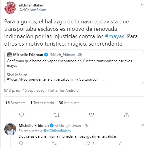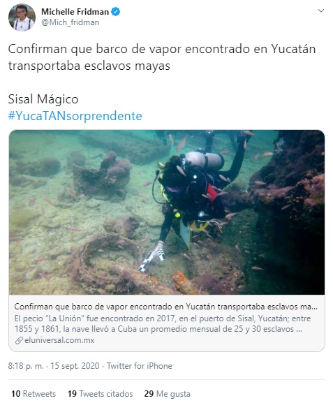 Mérida, Yucatán, 16 de septiembre del 2020.- Usuarios y usuarias de redes sociales criticaron a la Secretaria de Fomento Turístico, Michelle Fridman, por considerar “mágico” el descubrimiento de un barco esclavista en la costa yucateca.