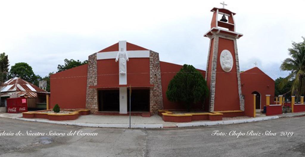 Para el área de servicios religiosos, desde el trazo original del poblado, se escogió al norte del parque principal un amplio terreno que permitiera a futuro esta construcción, así como instalaciones para alojar a los sacerdotes, seminaristas y misioneras que en estuvieron en diversas épocas en la Colonia Yucatán. Este templo sobrevivió a un grave incendio que destruyó sus techos de madera, láminas y plafones, muebles de madera, así como las imágenes de adoración originales, en un doloroso incidente acaecido el 23 de diciembre de 1978, en plenas festividades navideñas. Ese suceso resultó un duro golpe para la feligresía local del cual supo reponerse. Este edificio cuenta al frente con un gran Cristo del Sagrado Corazón de Jesús y en el campanario aledaño la imagen a relieve de la Virgen del Carmen, patrona de la población.