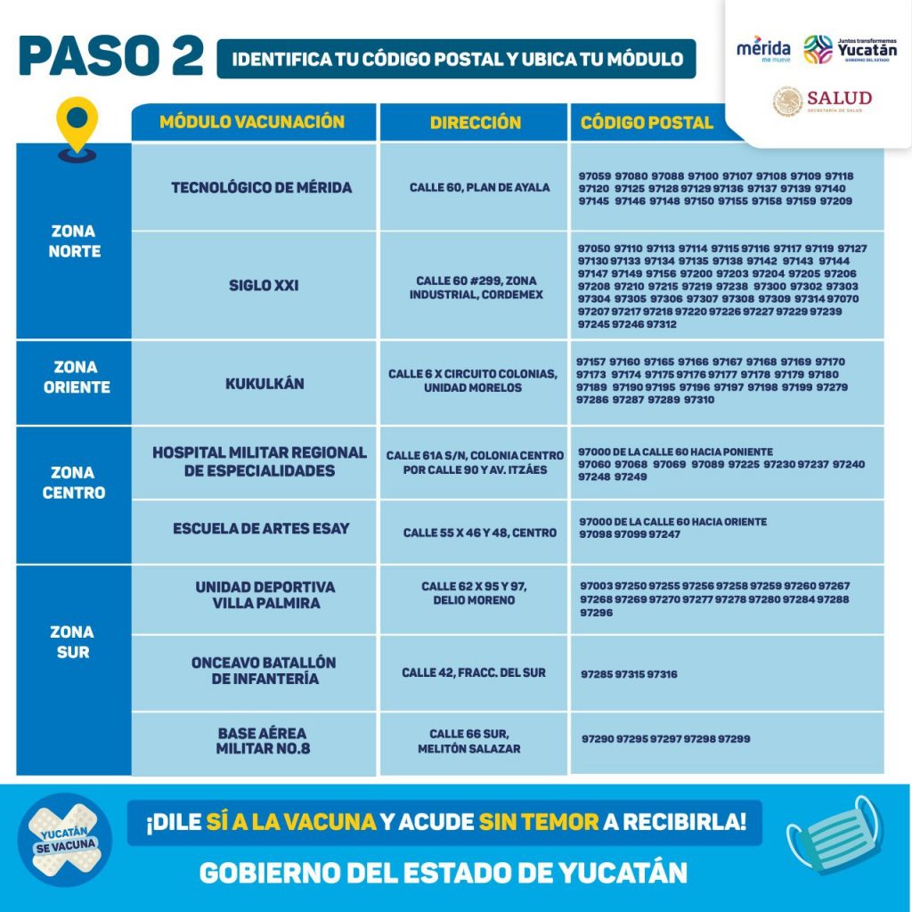 El Gobierno del Estado, el Ayuntamiento de Mérida y la Secretaría de Bienestar informaron que ese proceso se realizará en 2 macrocentros y 6 módulos de vacunación distribuidos estratégicamente en la ciudad.