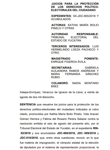 El primer recurso fue presentado por la panista Kathia Bolio Pinelo en agosto de 2018. En esa ocasión, el Tribunal Electoral del Estado de Yucatán (TEEY) revocó la validez de la constancia de la diputación plurinominal en la LXII Legislatura local que, respetando el criterio de paridad de género, le había otorgado a la panista el Instituto Electoral y de Participación Ciudadana (IEPAC).