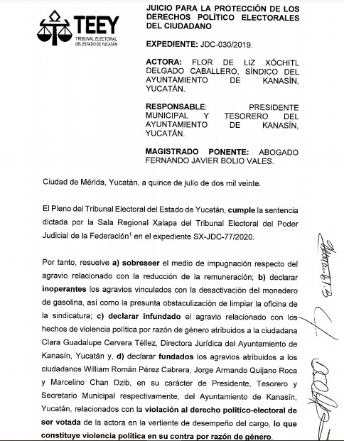 El pasado 15 de julio, en cumplimiento de una disposición del TEPJF, el TEEY resolvió que “existe un contexto general adverso en el Ayuntamiento de Kanasín hacia la actora, con la finalidad o el resultado de menoscabar el ejercicio efectivo del cargo que ostenta, lo cual se traduce en un contexto de violencia institucional, que ha sido tolerado por el presidente municipal. Se sostiene que los actos y omisiones desplegados en contra de la síndica constituyen violencia política por razón de género”.