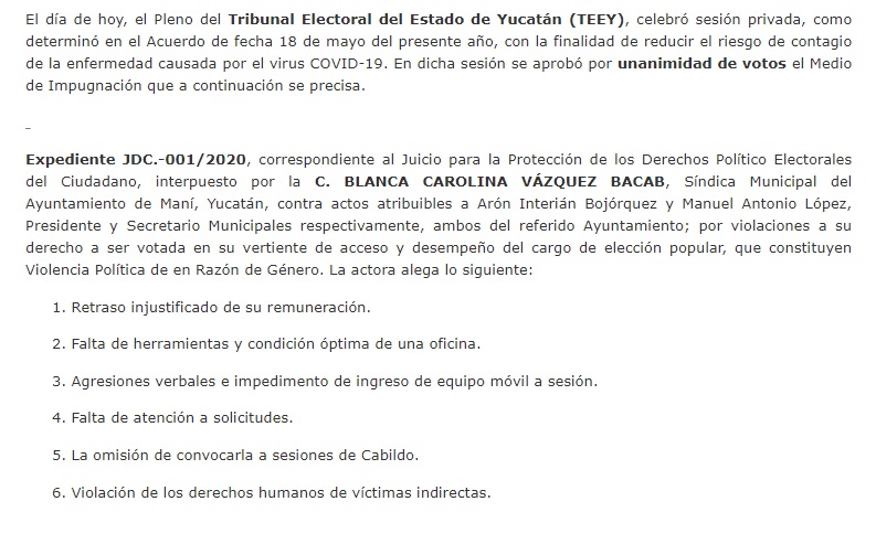 A inicios del pasado mes de septiembre, el TEEY resolvió que era fundada la violencia política en razón de género, derivada de la obstaculización del ejercicio del cargo de la servidora pública. Por ello, exhortó a las autoridades del municipio a evitar el retraso del pago de su sueldo, brindarle las condiciones necesarias para el desempeño de sus funciones, convocarla a las sesiones de cabildo, así como garantizarle un ambiente libre de agresiones u hostilidades.