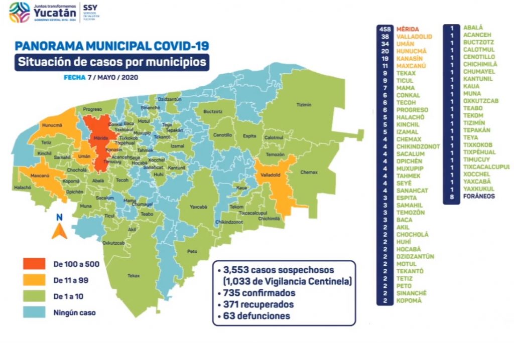 En más de la mitad de los municipios yucatecos ya hay casos de COVID-19 (coronavirus): a la fecha se han confirmado 735 diagnósticos del virus en 61 comunidades. 63 personas han fallecido: tan solo en las últimas 24 horas se reportaron seis decesos.