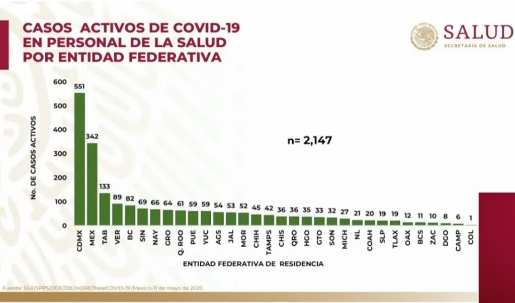 La entidad ocupa el lugar número 11 por las cifras de casos activos del virus en profesionales del área de la salud, de acuerdo con datos proporcionados por el Subsecretario de Prevención y Promoción de la Salud de la Secretaría de Salud Federal, Hugo López-Gatell Ramírez.