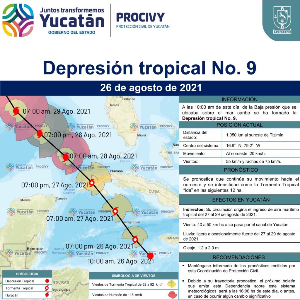 Mérida, Yucatán, 26 de agosto del 2021.- La Coordinación Estatal de Protección Civil (Procivy), informó sobre la formación de la novena depresión tropical en el Caribe, distante a más de mil kilómetros al sureste de Tizimín.