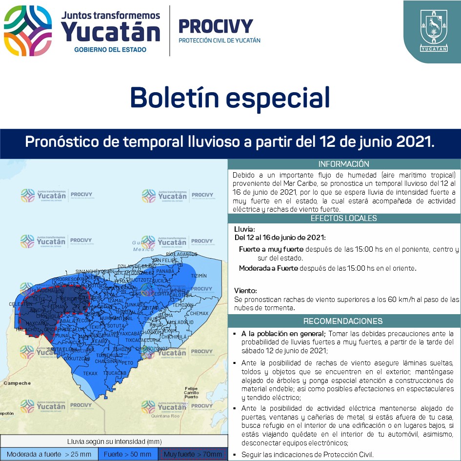 Mérida, Yucatán, 10 de julio de 2021.- El titular de la Coordinación Estatal de Protección Civil (Procivy), Jesús Enrique Alcocer Basto, informó que, debido al ingreso de un flujo de humedad proveniente del Mar Caribe, del 12 al 16 de junio, habrá lluvias de fuertes a intensas en la mayor parte del territorio.