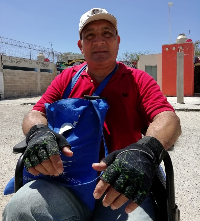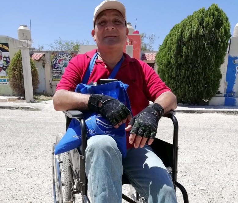Don José es originario de Campeche, a sus 56 años es marino militar retirado y sufrió la amputación de la pierna izquierda debido a la diabetes que padece, por lo que su medio de traslado es la referida silla de ruedas.