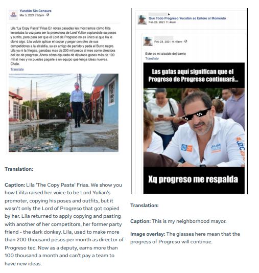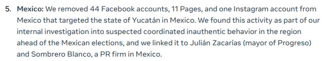 De acuerdo con su Reporte de Comportamiento Coordinado No Auténtico, Facebook detectó y eliminó 44 cuentas y 11 páginas en su red social, enfocadas en amplificar la campaña de reelección de Julián Zacarías a la alcaldía de Progreso, y criticar a su opositora, Lila Frías.