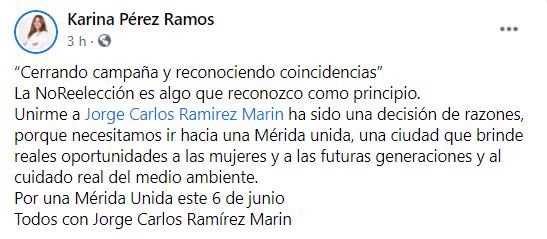 En el texto, Pérez Ramos se pronunció contra la reelección, en una clara referencia al panista Renán Barrera Concha, y pidió apoyar a Ramírez Marín en las urnas el próximo domingo. El abanderado del PRI compartió la foto con la ex candidata y le agradeció por sumarse a su proyecto.