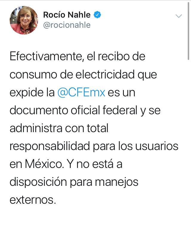 García Nahle contestó esa publicación y confirmó que el recibo de consumo de electricidad expedido por la Comisión “es un documento oficial federal y se administra con total responsabilidad para los usuarios en México”, por lo cual “no está a disposición para manejos externos”.