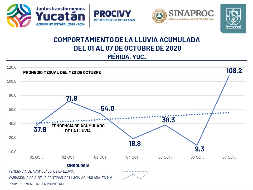 Por lo tanto, en sólo una semana, ha caído en Mérida el 33% de su promedio anual de lluvias en octubre, que es de 1,020 mm. Los registros de precipitaciones para cada uno de estos primeros 7 días del mes en la capital del estado son, respectivamente: 37.9, 71.8, 54.0, 18.8, 38.3, 9.3 y 108.2 mm, para un total de 338.3 mm.