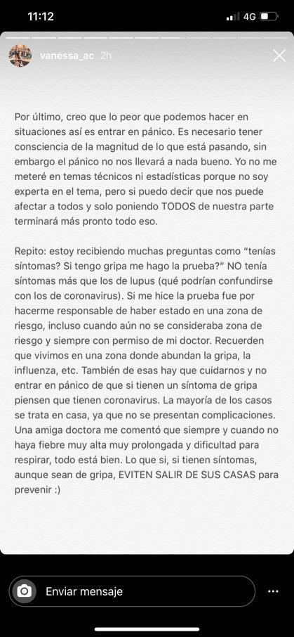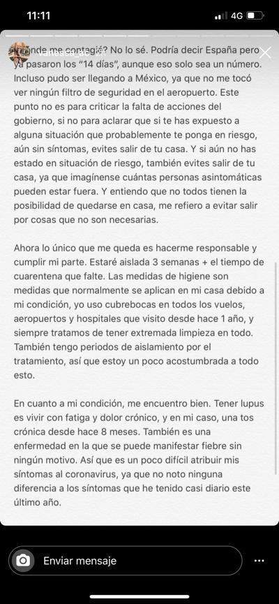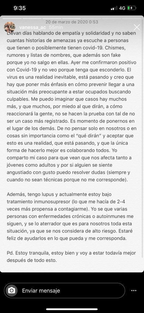 “No saben cuántas historias de amenazas ya escuché a personas que posiblemente tienen COVID-19. Chismes, rumores y listas de nombres, que además son fake porque yo no salgo en ellas. Ayer me confirmaron positivo con COVID-19 y no veo por qué tenga que esconderlo. El virus es una realidad inevitable, está pasando y creo que hay que poner más énfasis en cómo prevenir llegar a una situación más preocupante a estar buscando culpables” (sic), sostuvo en un mensaje publicado en su cuenta de Instagram.