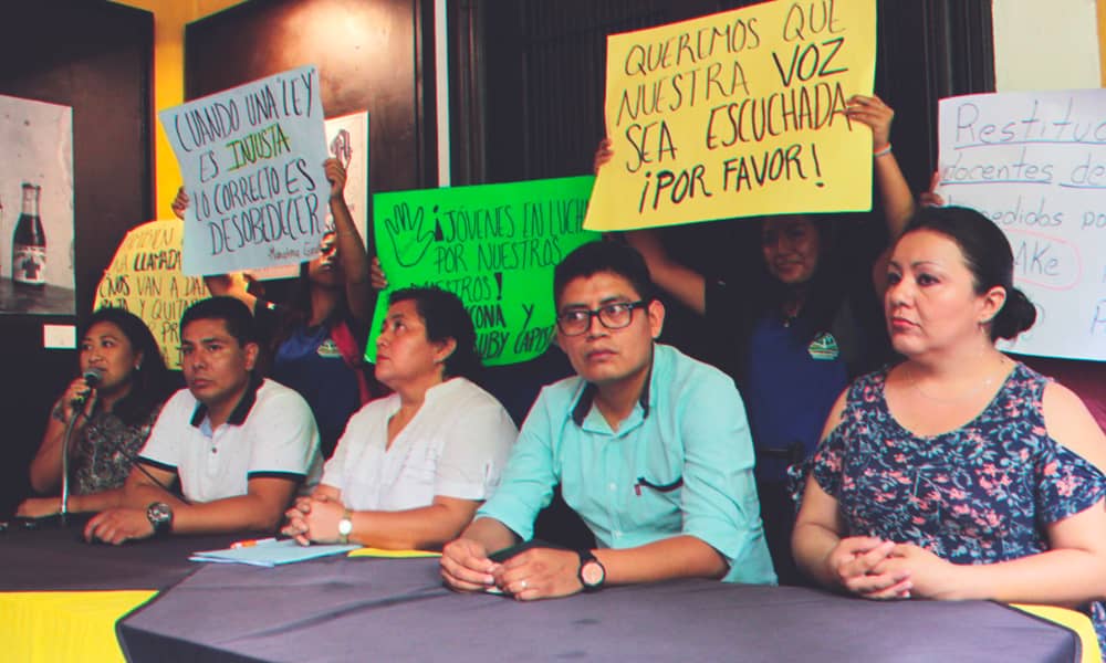 Este lunes 2 de septiembre, maestros y representantes del Frente Único Nacional de Trabajadores del Telebachillerato Comunitario (Funttbc) , llevaron a cabo una rueda de prensa para exigir al gobernador solución a los despidos que han padecido.